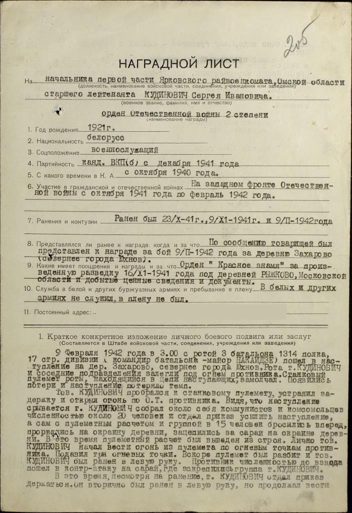 | Вишняков А.С., краевед и летописец нашей дивизии, неоднократно встречался с Сергеем Ивановичем Кудиновичем, записал его воспоминания. Из газеты «Чеховский вестник» от 01.12.1994 года, автор А.С. Вишняков: «День 16 ноября был тоже боевым и напряженным для наших войск. По-прежнему неустанно работали артиллеристы. 161 ОЗАД вел огонь по самолетам противника, выпустив 5-7 снарядов. 320 пап подавил 8 батарей противника (в каком месте, не указывается), вел огонь по скоплению пехоты и танков в Леонове. Всего израсходовано 613 снарядов (122-х и 152-х мм). Огрызались фашисты. Весь день 16 и 17 ноября они вели сильный минометный и изредка артиллерийский огонь. При этом отмечено: близ д. Высоково из 10 упавших снарядов не разорвались 4, близ Растовки – 3 из 6. В этот день, 16 ноября, отличилась группа разведчиков под командой командира разведки Кудиновича Сергея Ивановича и младшего политрука Ягодцева Ильи Николаевича. Углубившись в тыл противника на 4 километра от переднего края в районе деревни Муковнино, она вела наблюдение с опушки леса за передвижением вражеских войск по дороге, находившейся в 150 метрах. Выставили боевое охранение между дорогой и опушкой леса, послав в него мальчика Васю Ткаченко. Проводя наблюдение за противником, командир Кудинович, младший политрук Ягодцев и младший лейтенант Ежов приготовились составлять донесение, находясь в трехстах метрах от противника в лесу. В это время по дороге проходил дозор противника в количестве 12 человек. Фрицы заметили задремавшего Васю и окружили его. Командир разведки громким голосом приказал мальчику упасть на землю, а сам с бойцами открыл огонь по фашистам. По ним открыли огонь и другие солдаты, находившиеся в засаде с противоположной стороны. В завязавшейся перестрелке фашистский дозор был полностью уничтожен. Но был убит по неосторожности и наш сержант Марченко, который открыл себя, осматривая отказ своего автомата. Подоспел взвод противника, который повел наступление на разведчиков, занявших оборону на опушке леса. Командир роты так расставил свои силы, чтобы они, углубляясь в лес, все время держали немцев под перекрестным фланговым огнем. Когда противник втянулся в лес, лейтенант Кудинович с одним разведчиком зашли в тыл пулеметному расчету немцев и забросали его гранатами, при этом пулемет и расчет были выведены из строя. Во взводе врага возникла паника, и он побежал, а наши разведчики, будучи в маскхалатах, хорошо маскируясь в снежном лесу, расстреливали немцев из автоматов. В результате часового боя был убит 31 фашист и 6 ранено. Взяв документы у убитых, захватив одного ефрейтора в плен и забрав тело убитого Марченко, наша разведгруппа отошла на передний край наших войск, так как противник начал вводить в бой свежие силы. В этой дерзкой вылазке разведчиков, кроме названных воинов, участвовали сержанты Аверьянов, Ковалев, Пиксайкин, рядовые Чернышенко, Голованов, Адучинов, Смирнов. Что сталось с юным разведчиком Васей Ткаченко? Оказавшись в коротком плену, он при беглом допросе ответил немцам, что русских в отряде до 60 человек, чем ввел в заблуждение фашистов. Как мне при встрече пояснил С.И. Кудинович, Васю они оставили у родных в Угодском Заводе, как только он был освобожден нашими войсками».